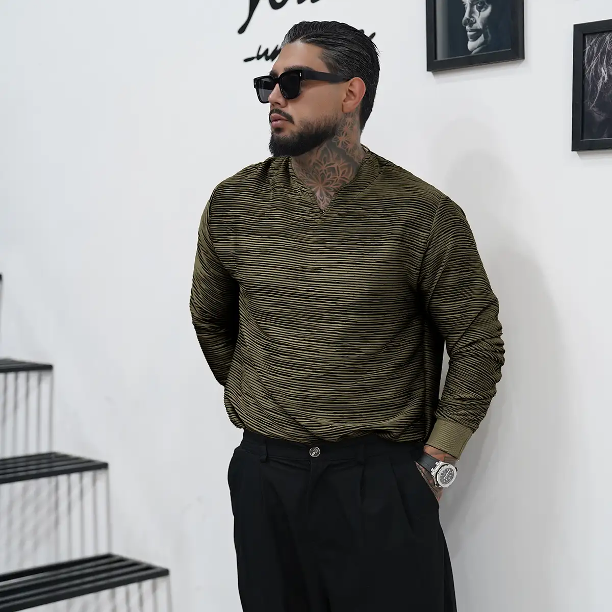 تیشرت آستین بلند یقه کوبایی سبز تیره مدل Nivad